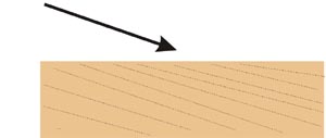 Wood cuts most cleanly down into the grain,the fibers of wood, thus: